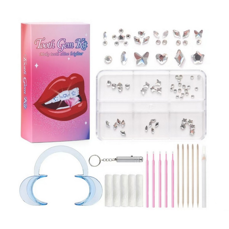 Además de su facilidad de uso, este kit se distingue por sus diseños exclusivos y su completo surtido, permitiéndote crear una sonrisa única que refleje tu personalidad. Con herramientas prácticas y una variada selección de pedrería, se adapta a tus deseos para un look sutil o audaz.