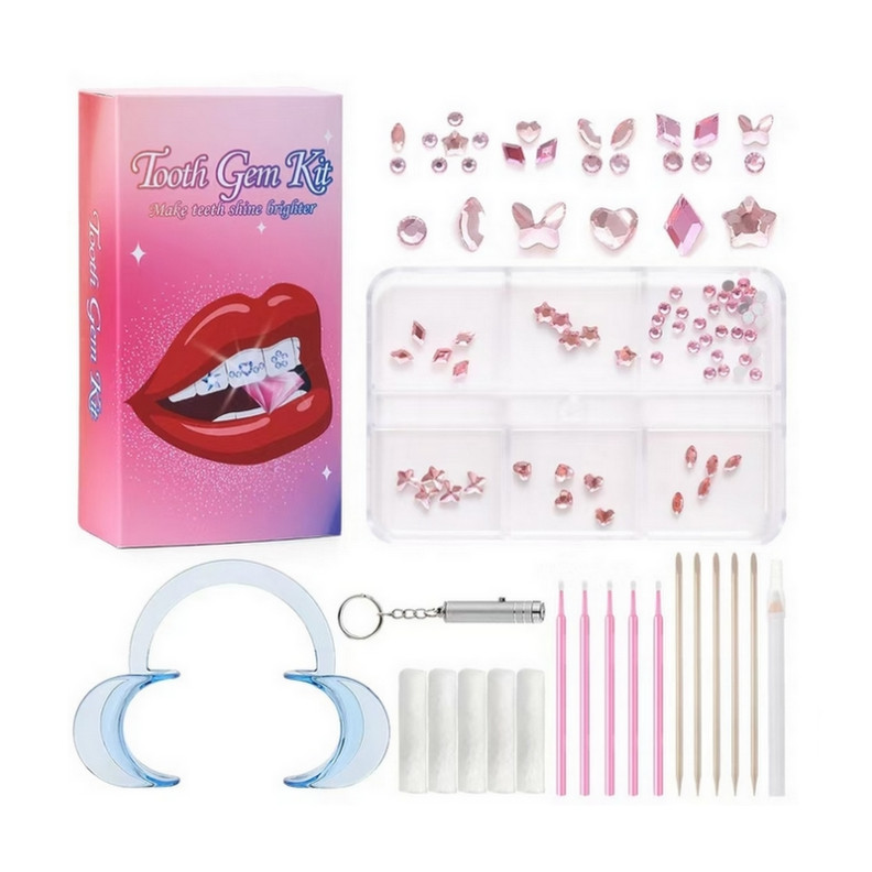 El kit incluye una variada selección de pedrería elegante y brillante, que va desde formas clásicas como círculos y estrellas hasta diseños más únicos como mariposas y corazones. Estos cristales están hechos de materiales no tóxicos y diseñados especialmente para respetar el esmalte dental.