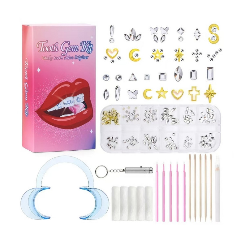 Además de su facilidad de uso, este kit se distingue por sus diseños exclusivos y su completo surtido, permitiéndote crear una sonrisa única que refleje tu personalidad. Con herramientas prácticas y una variada selección de pedrería, se adapta a tus deseos para un look sutil o audaz.