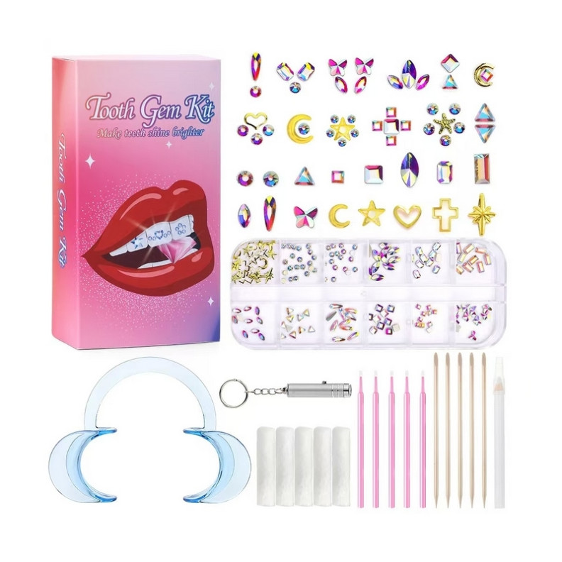 El kit incluye una variada selección de pedrería elegante y brillante, que va desde formas clásicas como círculos y estrellas hasta diseños más únicos como mariposas y corazones. Estos cristales están hechos de materiales no tóxicos y diseñados específicamente para respetar el esmalte dental.