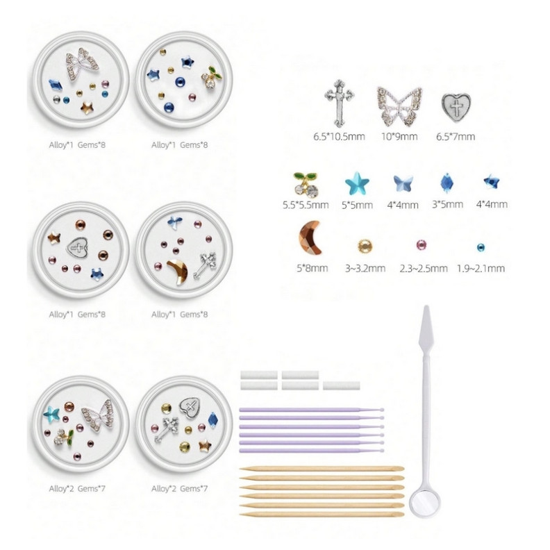 El kit incluye una variada selección de pedrería elegante y brillante, que va desde formas clásicas como círculos y estrellas hasta diseños más únicos como mariposas y corazones. Estos cristales están hechos de materiales no tóxicos y diseñados específicamente para respetar el esmalte dental.
