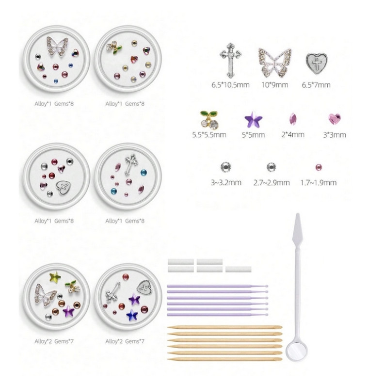 Un surtido de pedrería de colores elegante y variado: Diseños únicos, los pedrería incluidos están perfectamente diseñados para ofrecer un brillo duradero y elegante. Torundas de saliva, palitos de madera, aplicadores, una espátula con espejo.